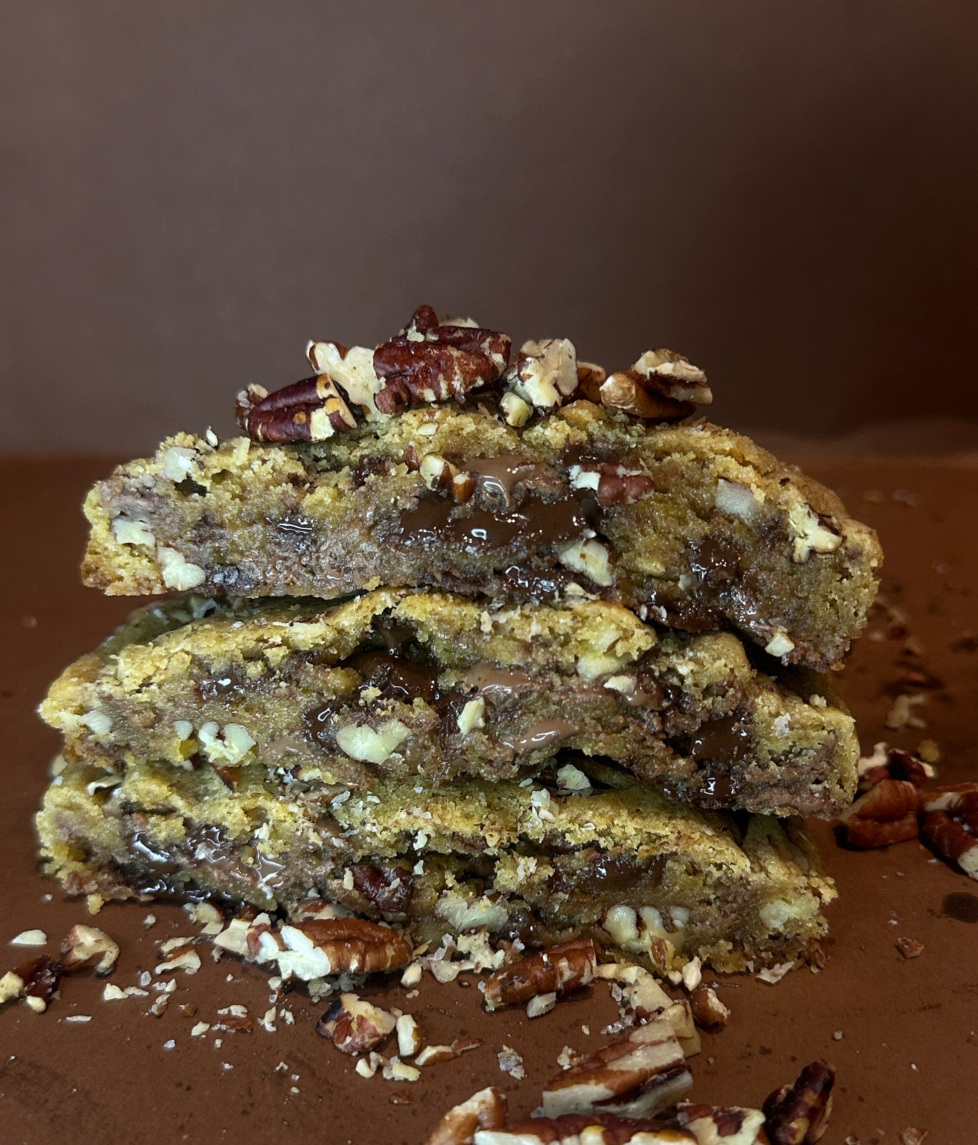 En cookie på 150g, fylt med ristede pekannøtter, melkesjokolade, mørk kokesjokolade og deilig havsalt på toppen. Perfekt for deg som elsker pekannøtter og sjokolade.
